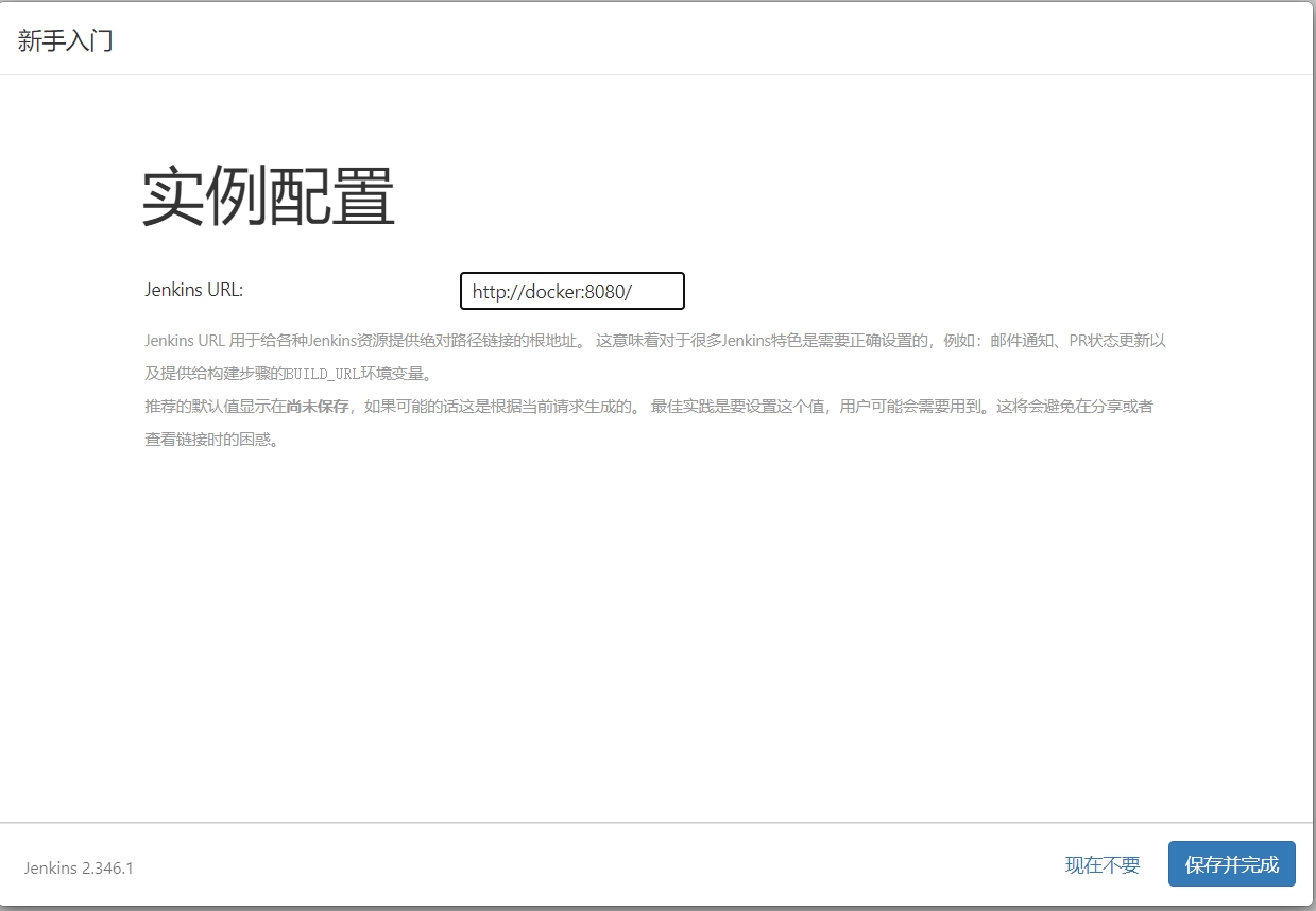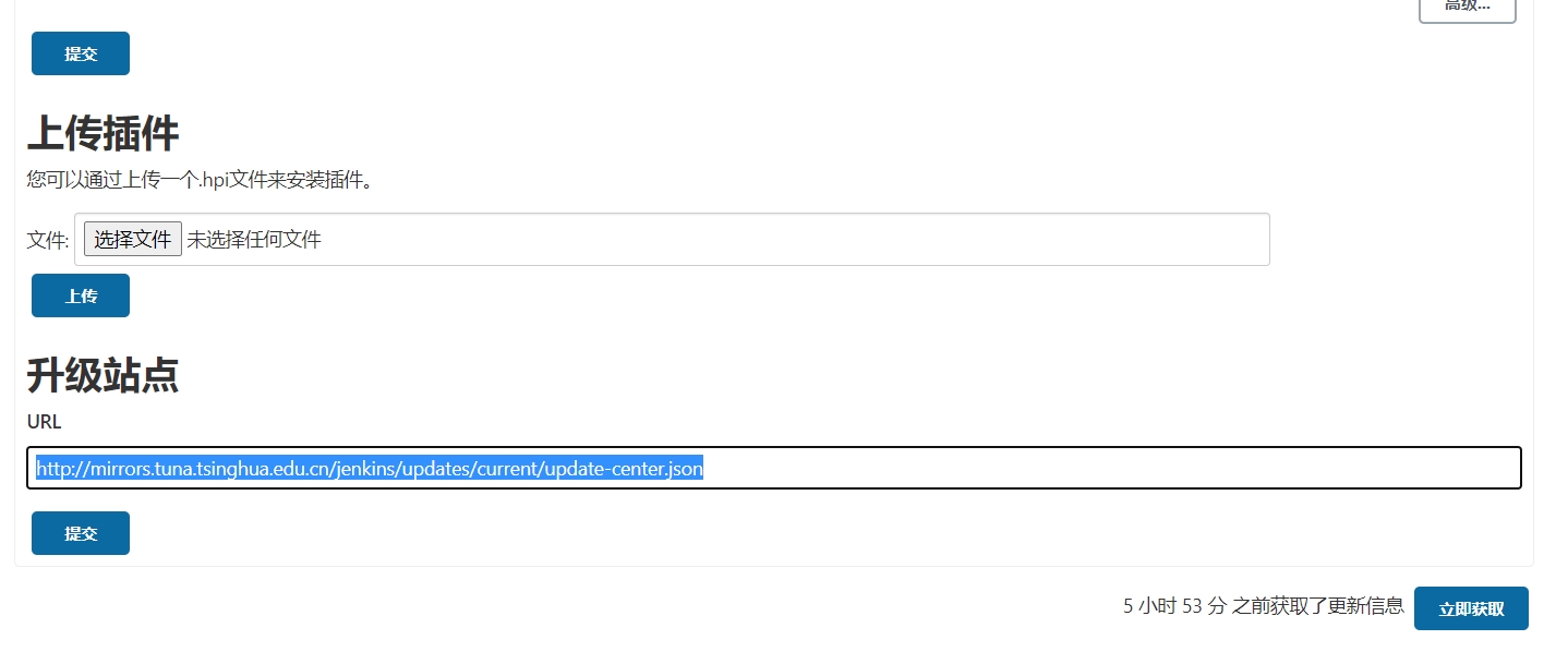 说明: 配置插件站点地址,是为了防止国外站点链接超时或者下载插件缓慢,这里采用是 http://mirrors.tuna.tsinghua.edu.cn/jenkins/updates/current/update-center.json