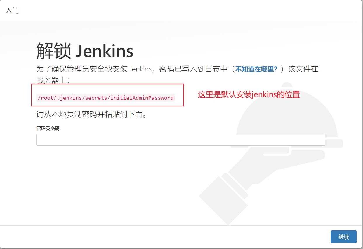 启动完成后,要求输入初始的管理员密码,根据提示密码在/root/.jenkins/secrets/initialAdminPassword这个文件中,找到密码输入,点击继续