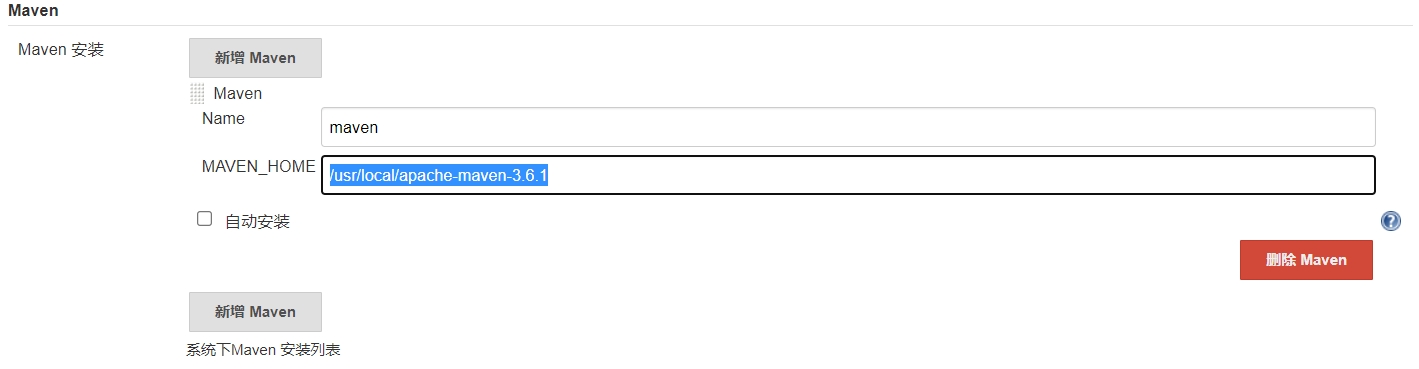 指定版本后,勾选自动安装,jenkins在部署Java项目时会自动在/root/.jenkins/tools/hudson.tasks.Maven_MavenInstallation/