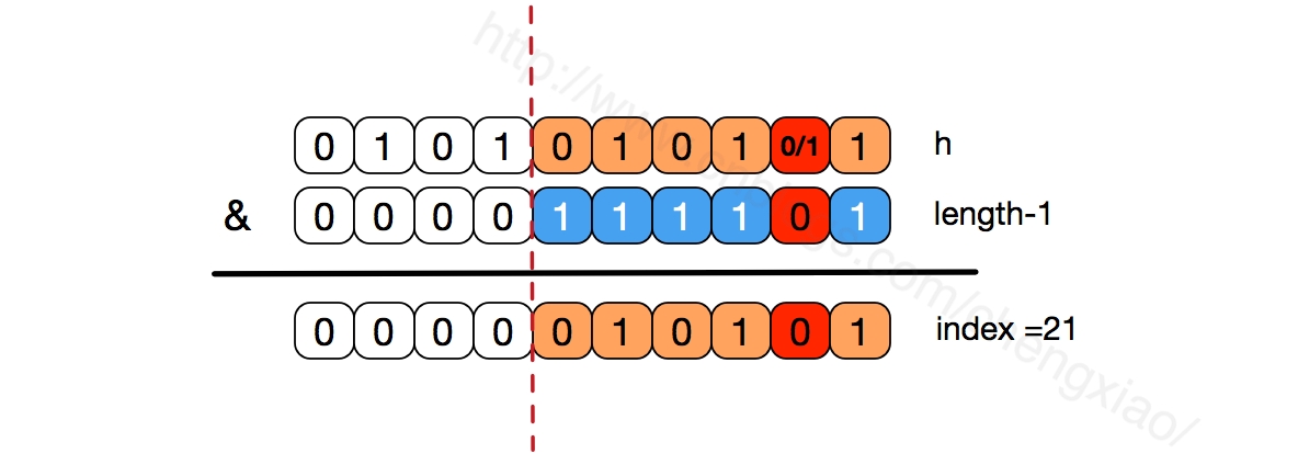 我们看到,上面的&运算,高位是不会对结果产生影响的(hash函数采用各种位运算可能也是为了使得低位更加散列),我们只关注低位bit,如果低位全部为1,那么对于h低位部分来说,任何一位的变化都会对结果产生影响,也就是说,要得到index=21这个存储位置,h的低位只有这一种组合。这也是数组长度设计为必须为2的次幂的原因。